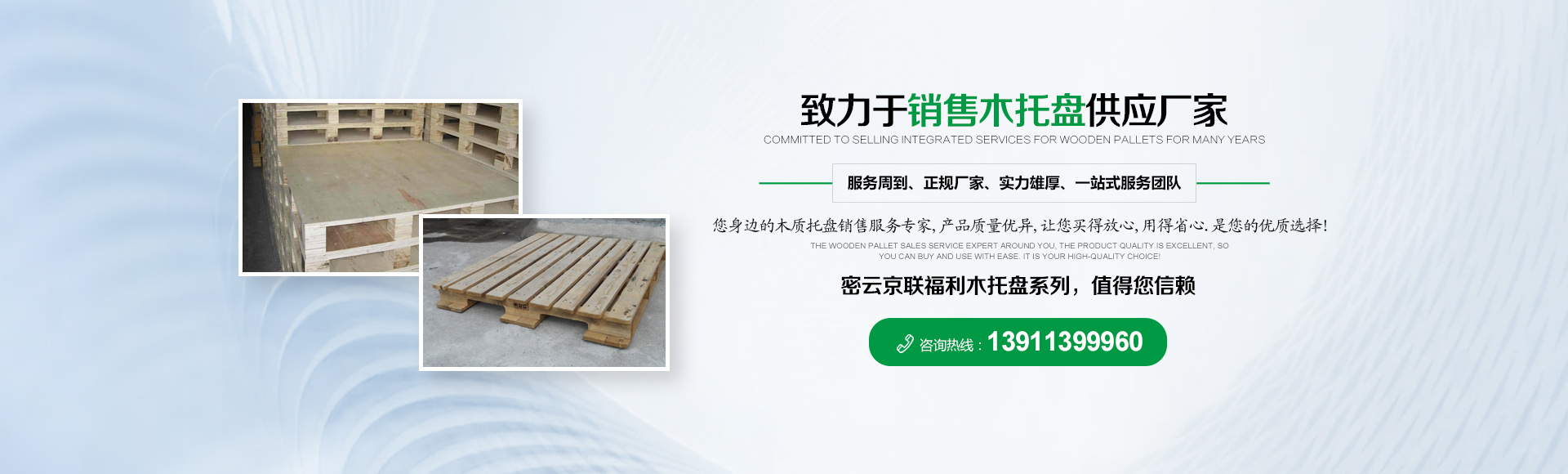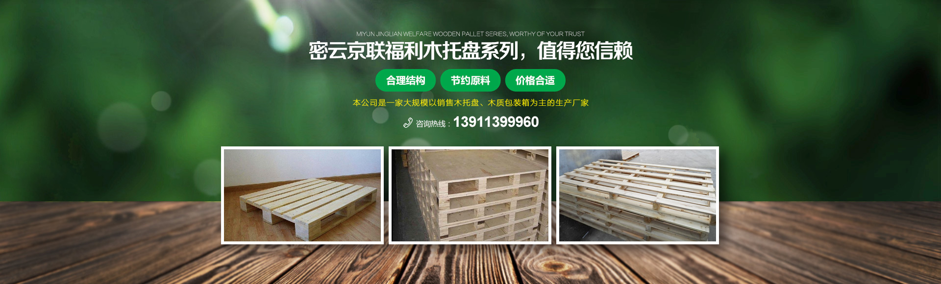 北京京聯(lián)國(guó)順木制品有限公司 (原北京市密云縣京聯(lián)福利木制品廠(chǎng))成立于1993年,位于北京市密云縣西田各莊鎮(zhèn)蒼頭村,占地約5000平米。我公司工廠(chǎng)是一家大規(guī)模以銷(xiāo)售木托盤(pán)為主的生產(chǎn)廠(chǎng)家。本工廠(chǎng)是一家直接采購(gòu)原木,按客戶(hù)要求生產(chǎn)規(guī)格尺寸的托盤(pán),我公司工廠(chǎng)位于河北省承德市有著木材加工點(diǎn),可以做到,從山上的木頭下山到客戶(hù)手中的托盤(pán)都是一手貨,減少了中間商的費(fèi)用,所以我公司售出的產(chǎn)品對(duì)北京這個(gè)龐大的市場(chǎng)來(lái)說(shuō)在同樣的規(guī)格尺寸的托盤(pán)來(lái)說(shuō)價(jià)格比較占優(yōu)勢(shì)。